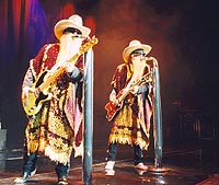 As the Mexican-wear comes off to reveal black suits, cuffs, collars and boots diamond-sparkling for all to see, 'Cheap Sunglasses' is brought to the fore. Singing their hearts out, Billy - as usual - wears what seems to be half a coconut atop his head, whereas Dusty goes for a more stylish Veteran's beret! Next, Billy talks about the delayed new album and whether or not they should play some tracks off of it tonight. The crowd convinces them that they should and so the impressive-sounding 'Buck Nekkid' is sung next. As they sing, cartoon-like images of the trio float ghost-like along the huge black curtain behind them.