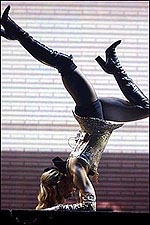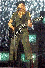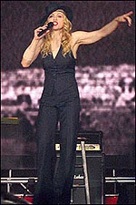 She also covered John Lennon's 'Imagine', accompanied by footage of war victims, and drew a huge cheer when an image of the late Beatle flashed on to the screens. The show closed with a medley of some of her biggest hits — 'Crazy For You', 'Music' and 'Holiday'. For the encore, 'Into The Groove' featured an appearance by rapper MISSY ELLIOTT and kilt-clad bagpipers, with Madge leaping on stage in her own kilt and tartan knickers!