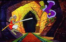 Well, he doesn't!! You see, if you're not on the ball from the off Dirk dies! So, as you stare open mouthed at the screem - wondering over and over 'Was I supposed to do something?' and 'Was I controlling him at some unnotified point?,' etc. You get another try, of course and this time you get yourself ready to hit the single action button to attack the creature in the moat. But, ... Dirk dies again! 'What am I doing wrong? I’m down to 3 lives already, and haven’t even gotten past the first monster!' I hear you gently scream at the screen. Did it help ... well, you try it again and this time you timed the attack right, and are able to proceed to the next scene! Good for you, ... the game is well and truly now on!